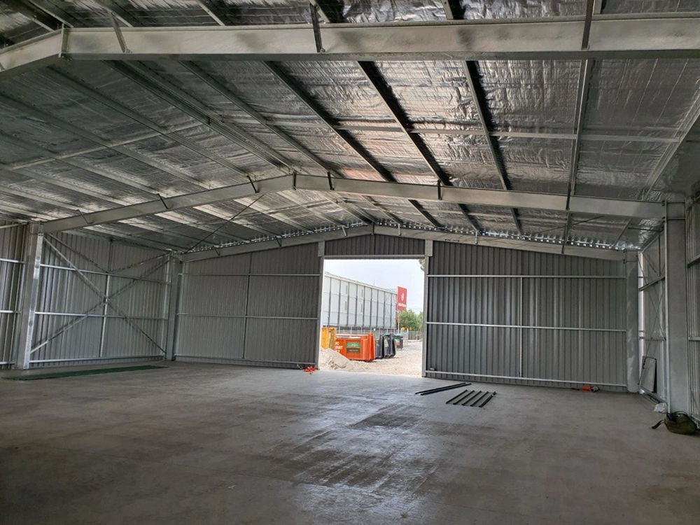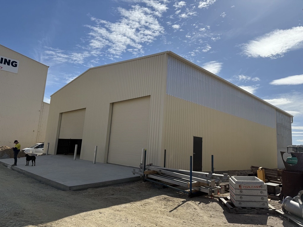 The build was completed with the installation of wall cladding, roofing, and automated roller doors, along with detailed external works including a concrete front entry apron, paving, and external hardstands.
