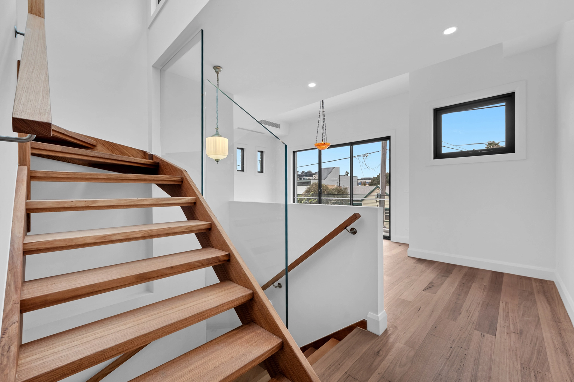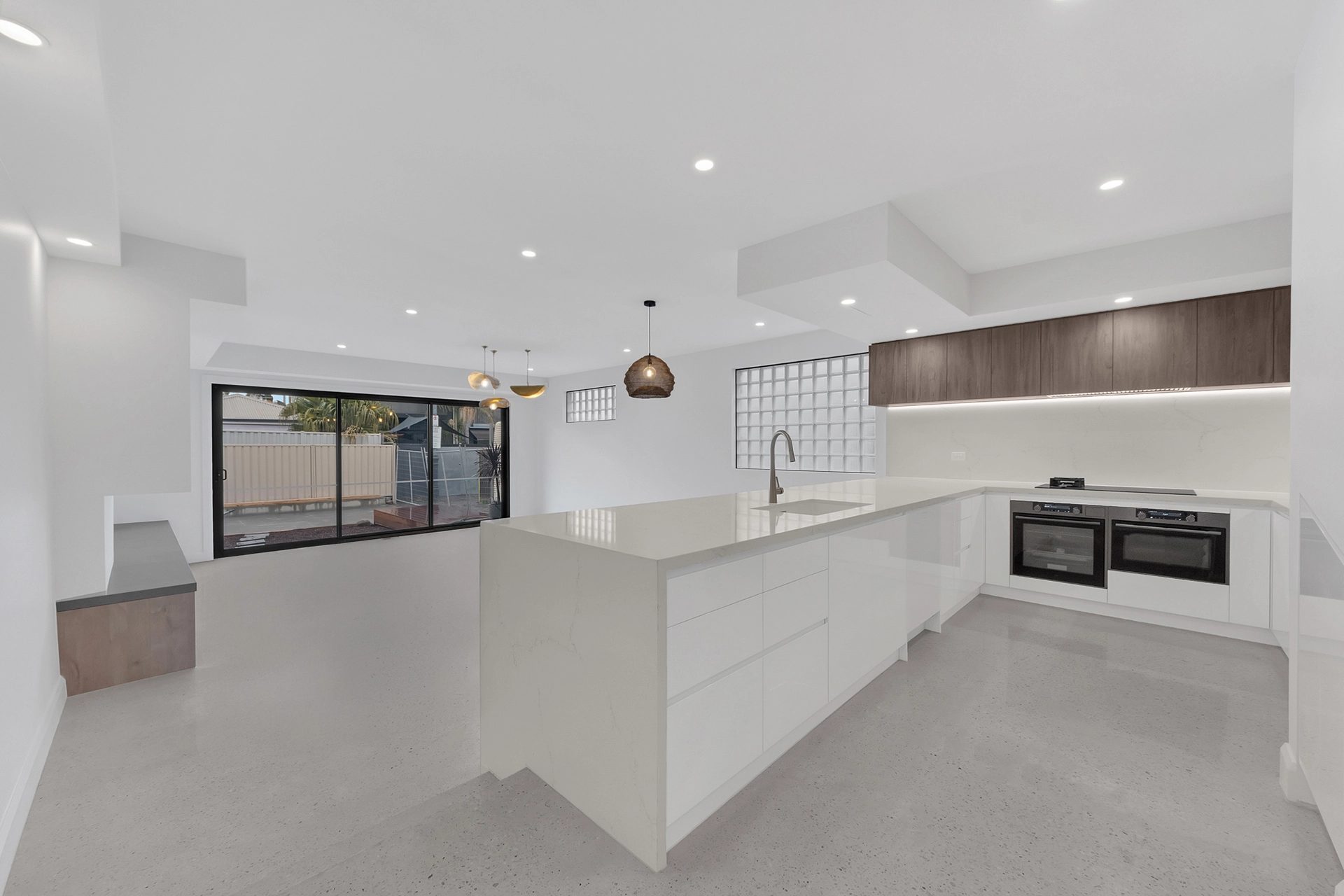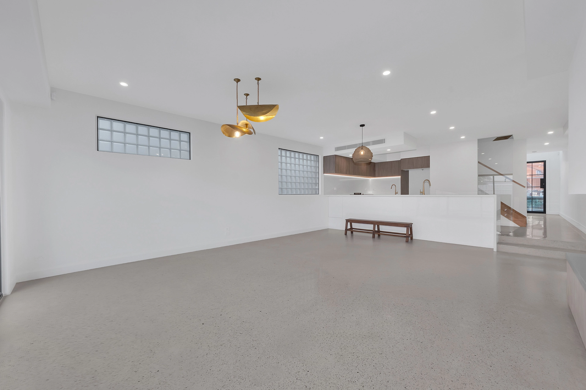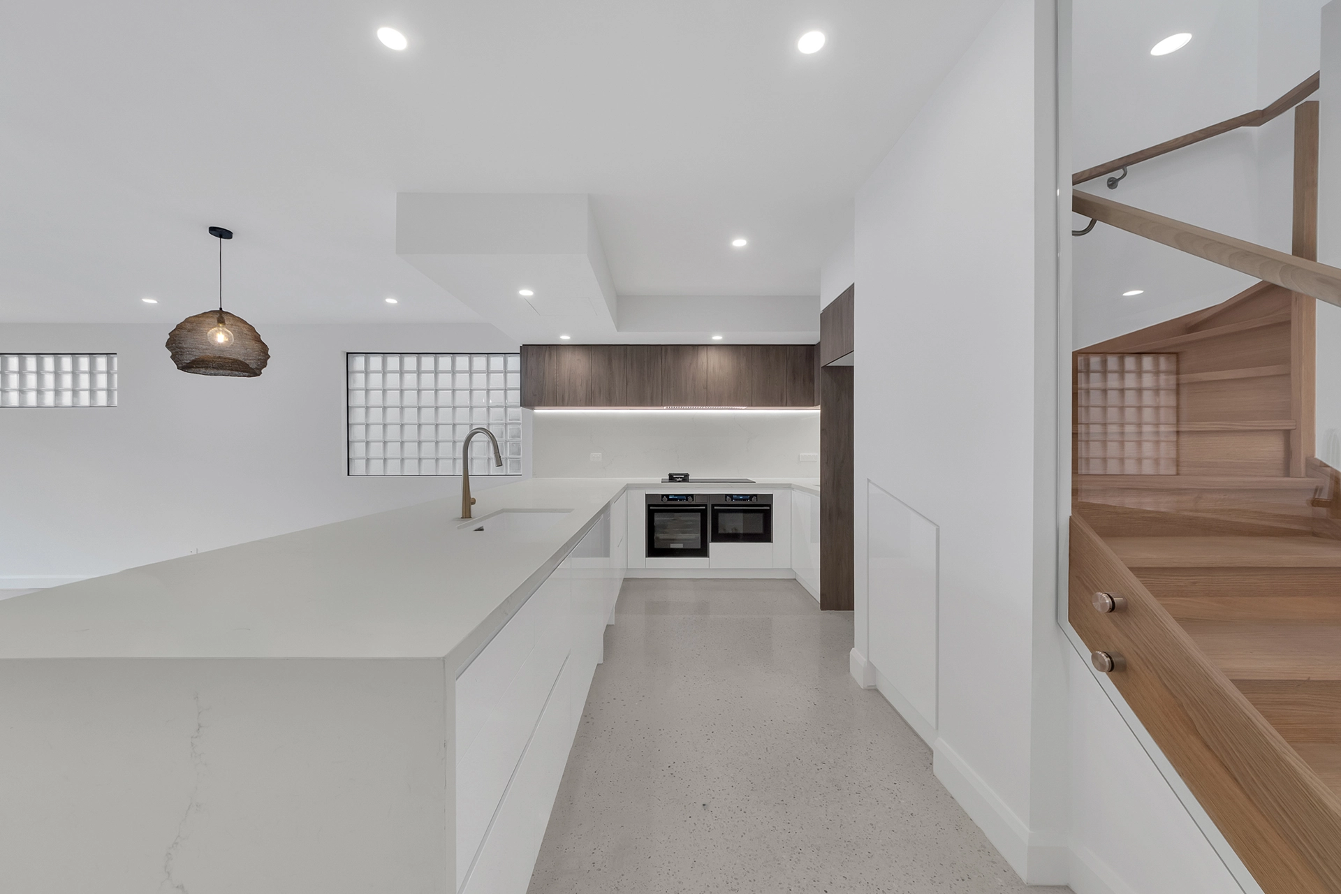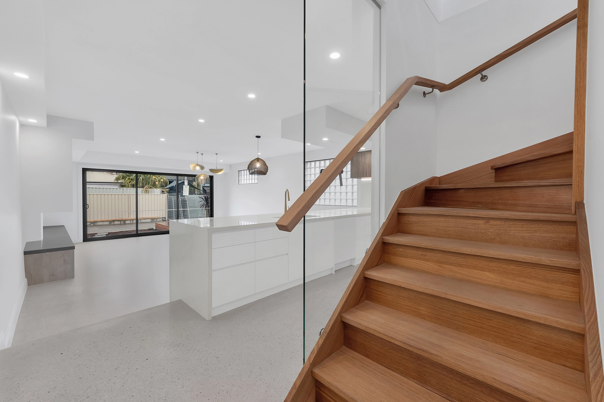 Internally, the home is a showcase of high-end architectural finishes—from polished concrete floors and timber details to floating staircases and expansive glazed windows that flood the space with natural light. Prioritising sustainability, the project achieved a 7-Star Energy Rating, incorporating passive design elements, high-performance insulation, and energy-efficient systems throughout.