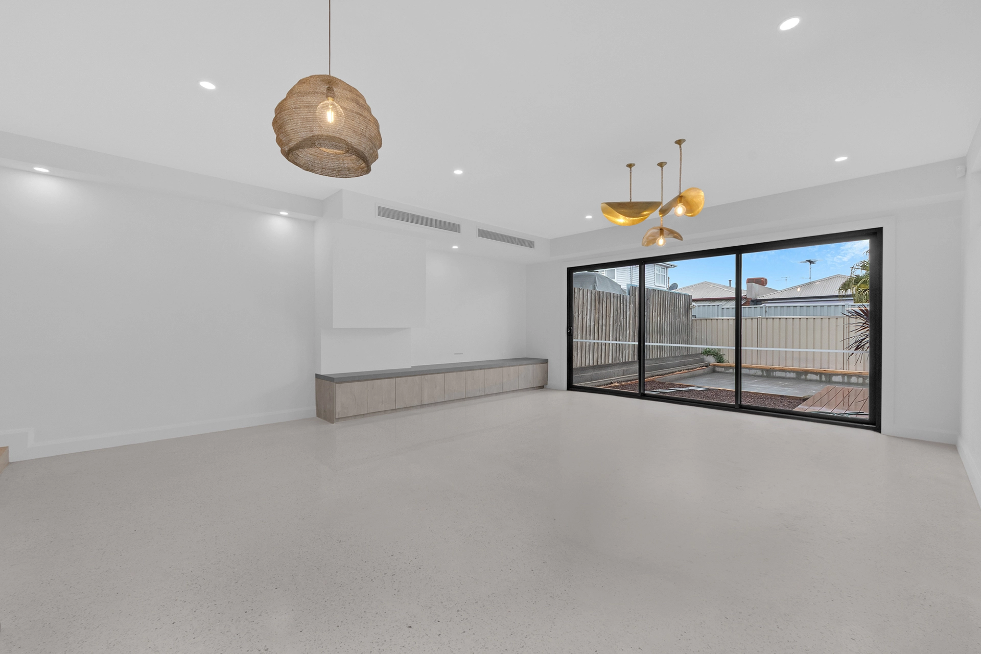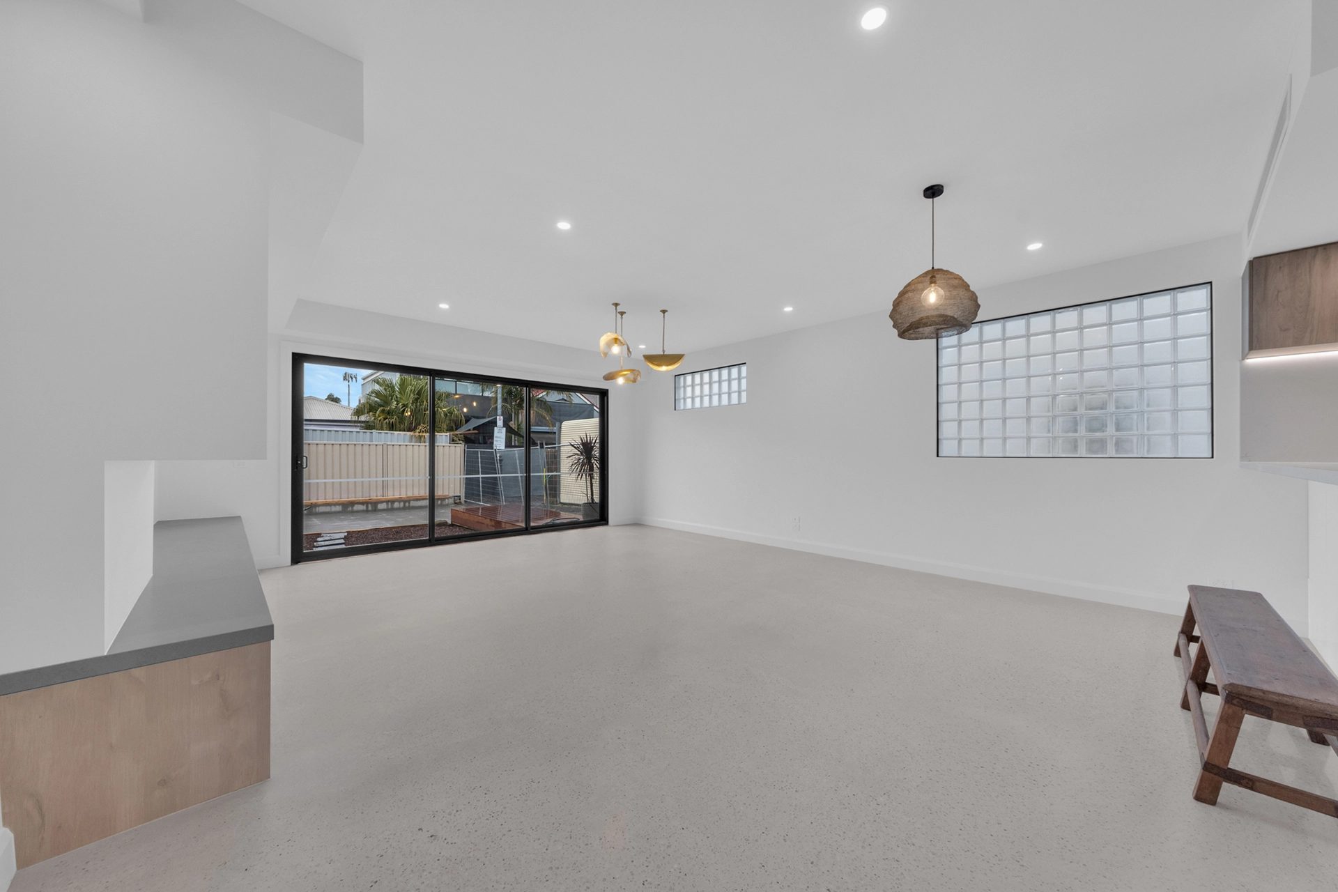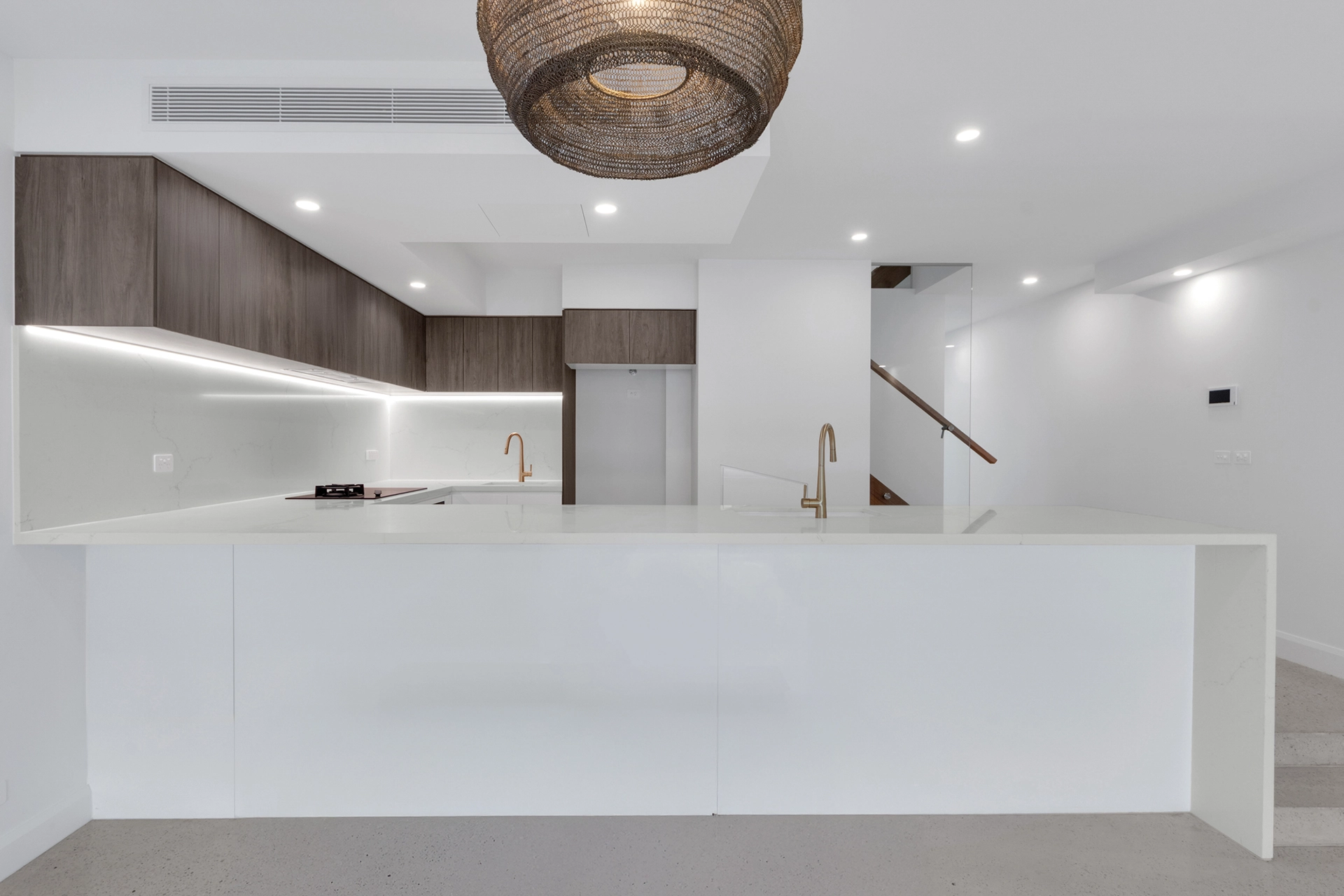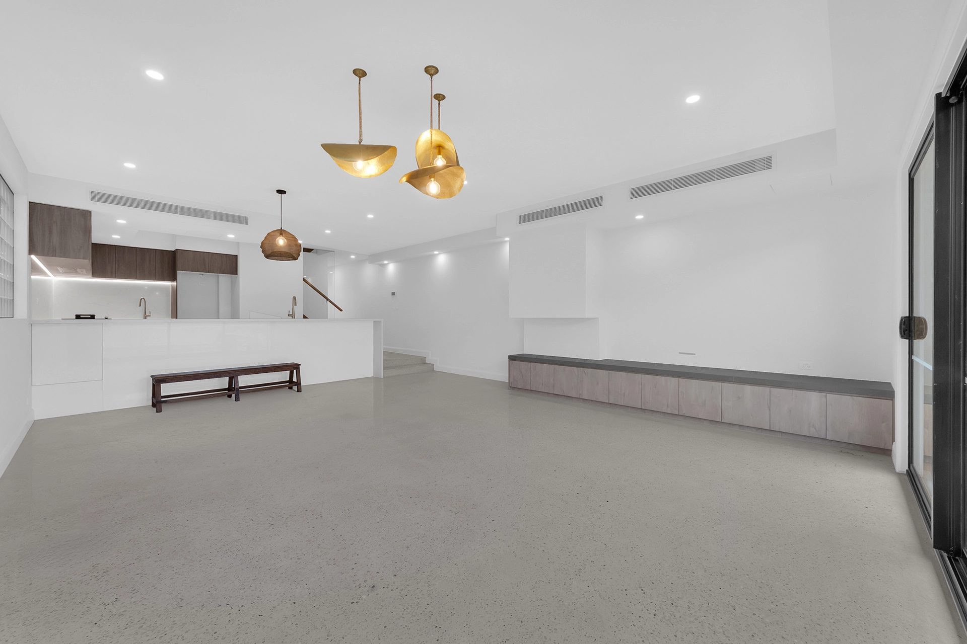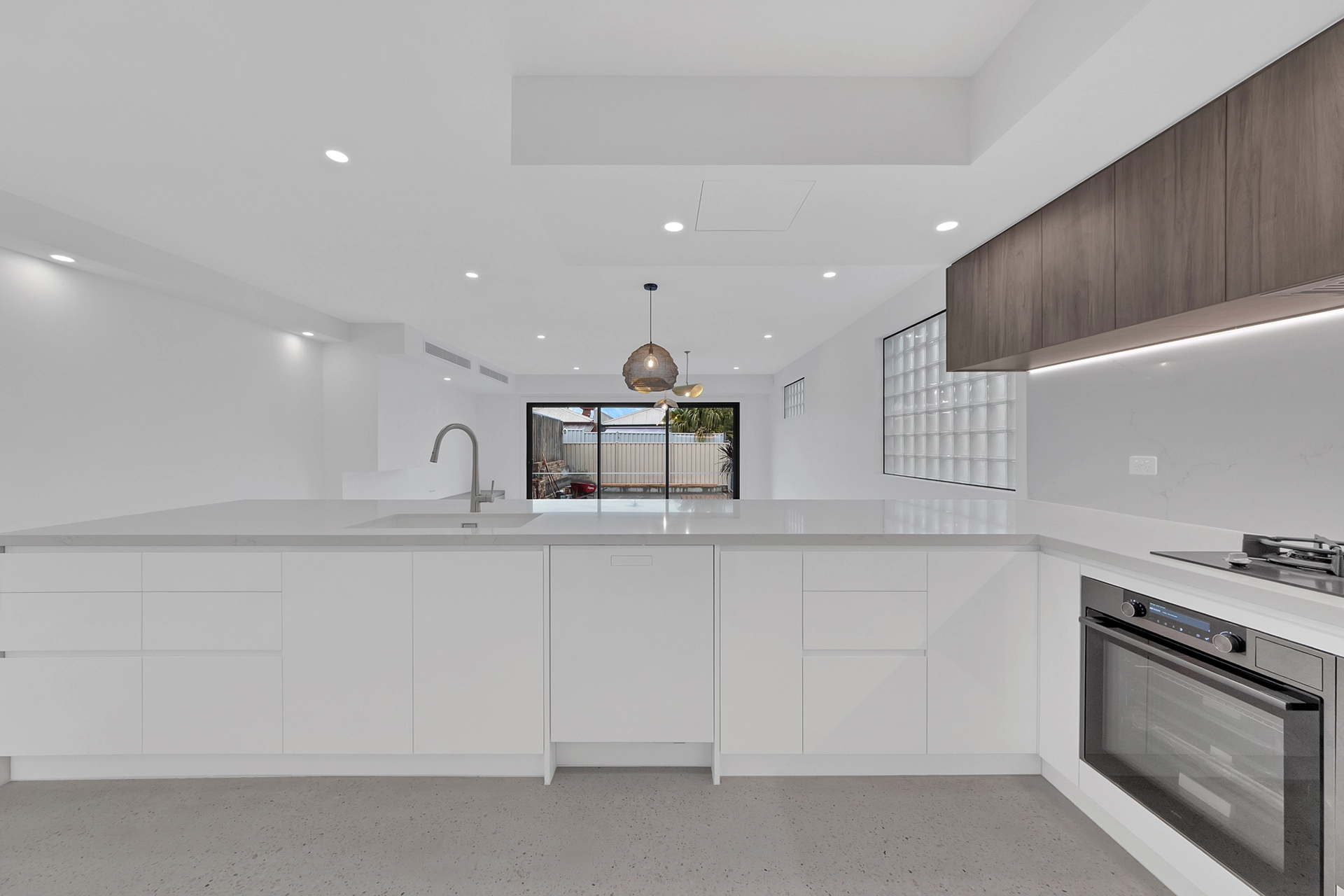 Internally, the home is a showcase of high-end architectural finishes—from polished concrete floors and timber details to floating staircases and expansive glazed windows that flood the space with natural light. Prioritising sustainability, the project achieved a 7-Star Energy Rating, incorporating passive design elements, high-performance insulation, and energy-efficient systems throughout.