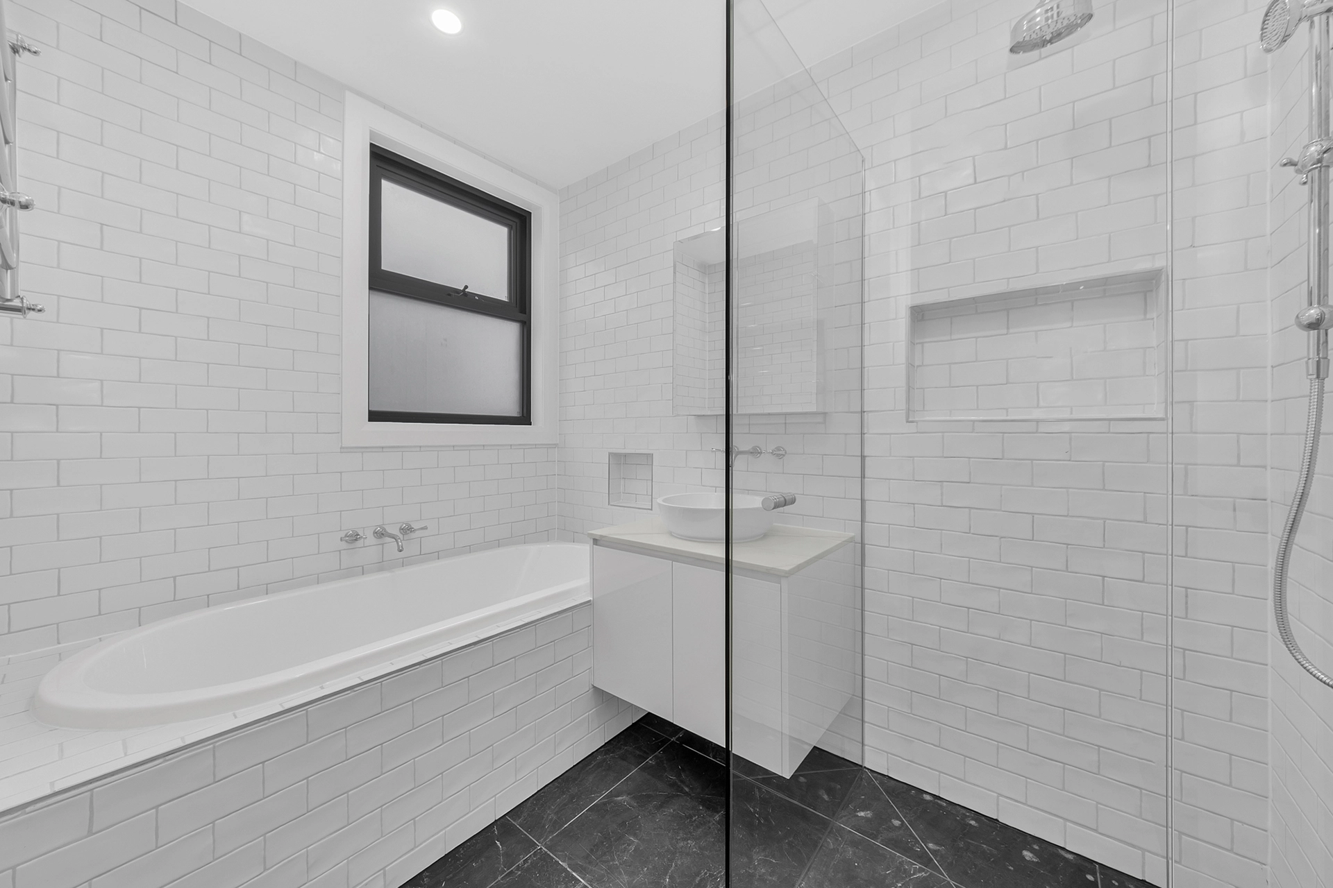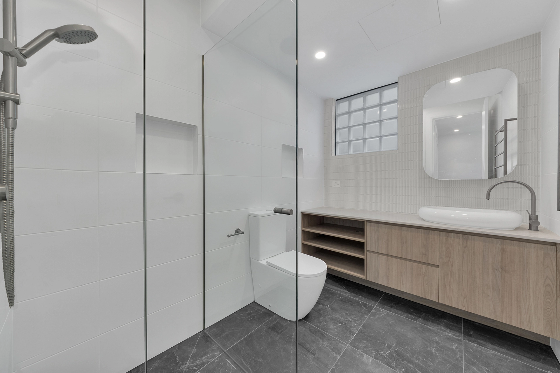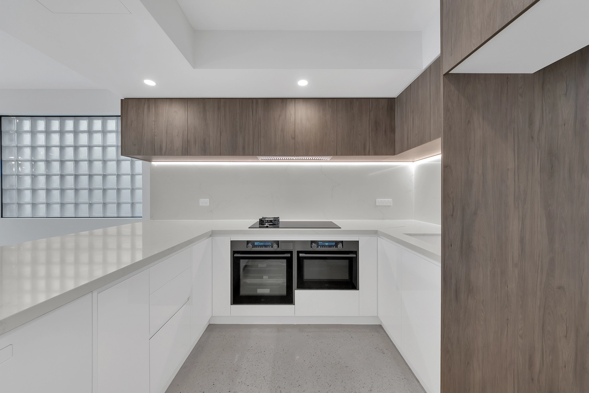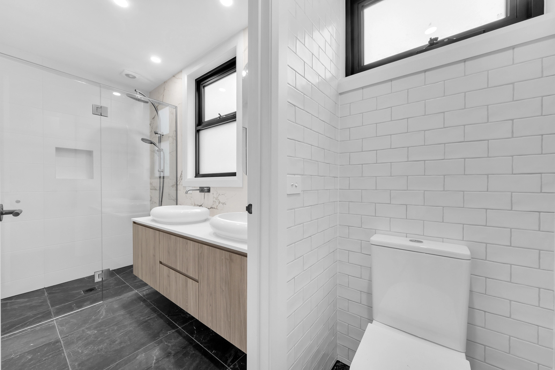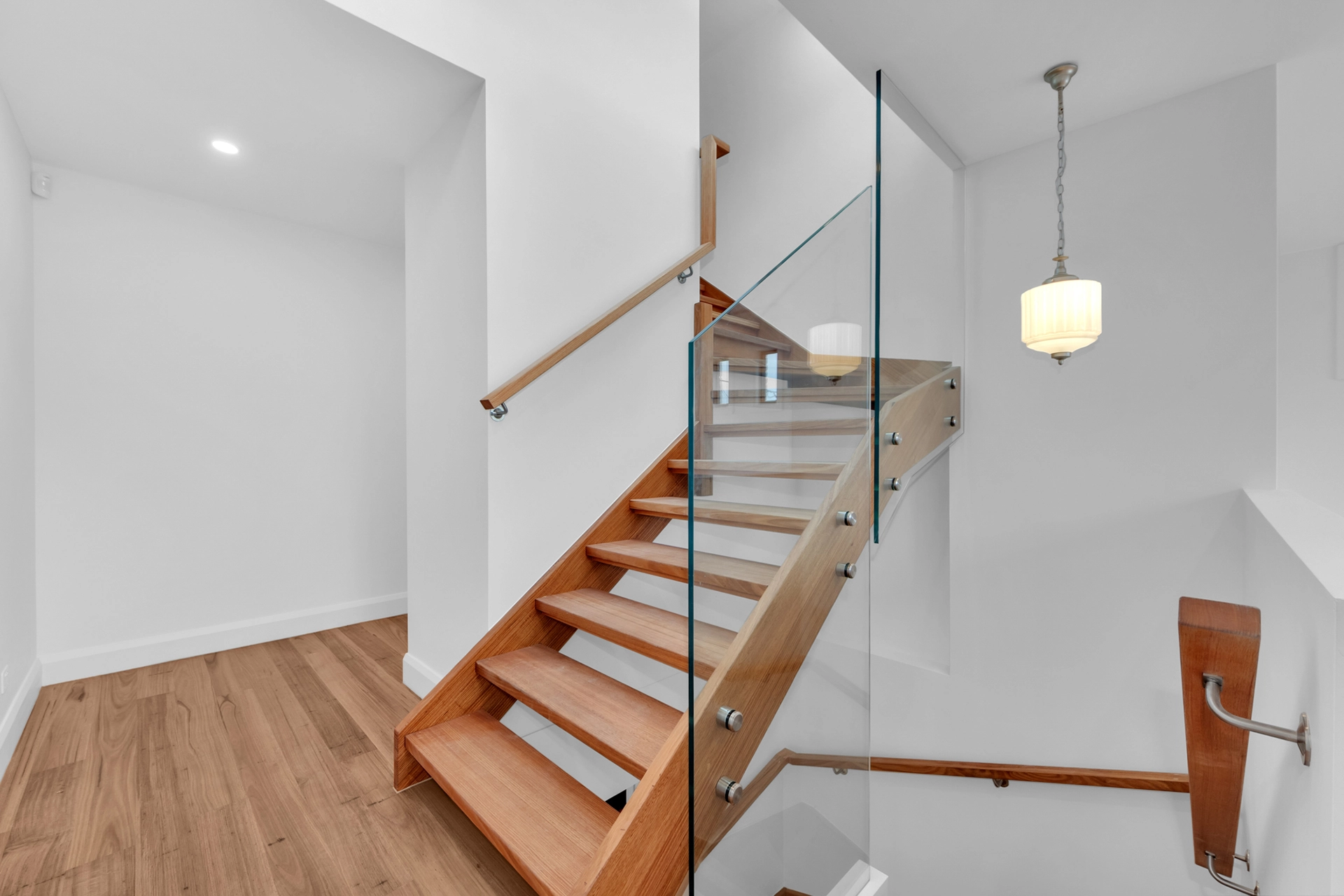 Internally, the home is a showcase of high-end architectural finishes—from polished concrete floors and timber details to floating staircases and expansive glazed windows that flood the space with natural light. Prioritising sustainability, the project achieved a 7-Star Energy Rating, incorporating passive design elements, high-performance insulation, and energy-efficient systems throughout.